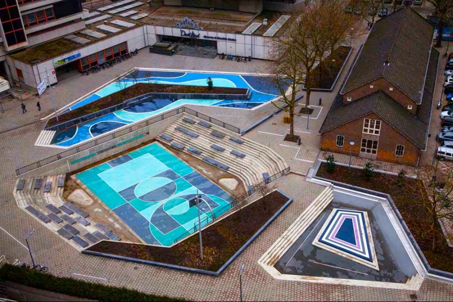 Watersquare Benthemplein – Resiliência hídrica: praça urbana multifuncional que funciona como espaço de lazer em dias secos, mas que atua como reservatório de retenção de águas pluviais durante grandes tempestades.