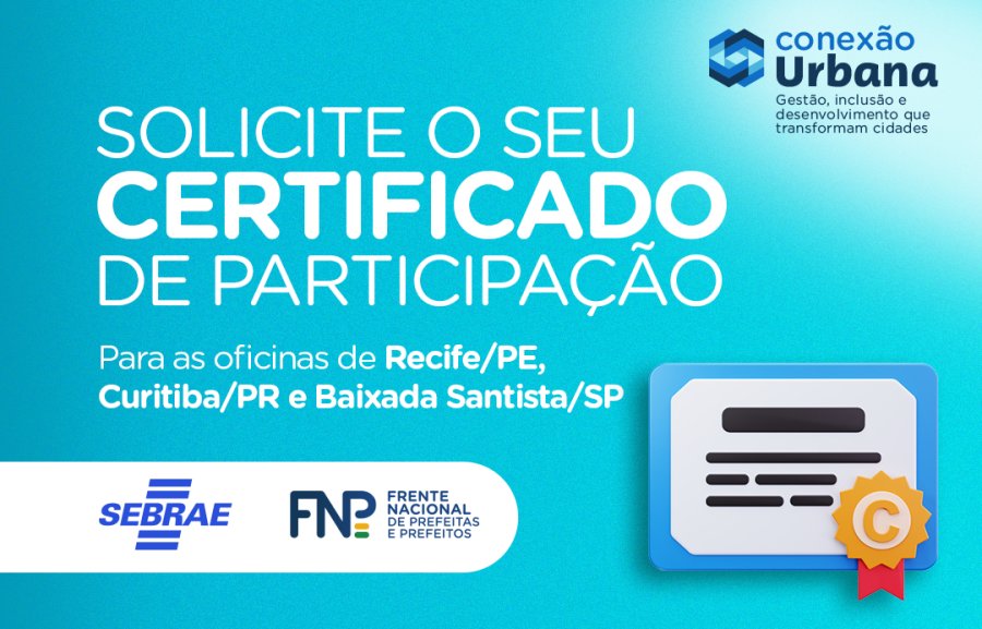 Nos últimos meses, o projeto Conexão Urbana promoveu oficinas técnicas voltadas ao desenvolvimento urbano e econômico nas Regiões Metropolitanas (RM) de Recife/PE, Curitiba/PR e Baixada Santista/SP. Dando continuidade aos processos administrativos, o projeto torna público a emissão dos certificados, de acordo com cada RM, para todos os participantes que desejarem o documento.